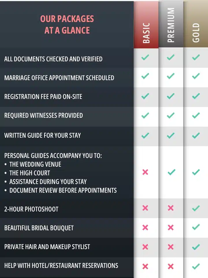Planning a wedding from abroad can be overwhelming and time-consuming. Avoid lengthy research and mistakes that could lead to unnecessary costs and delays. Relax while we take care of everything for you – from the first step to the perfect celebration.